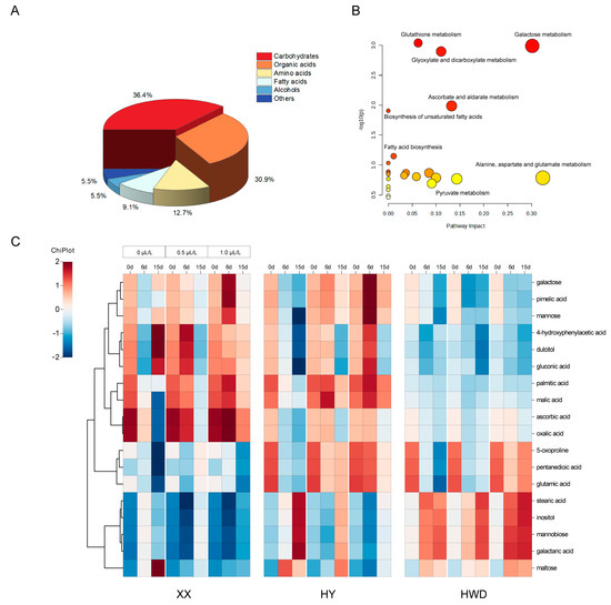 Effects of 1-MCP treatment on the metabolism of kiwifruits. (A) Distribution map of total metabolites categories, (B) metabolic pathway enrichment map, and (C) heatmap analysis of differential metabolites. In the heat map, red and blue represent the high and low relative contents of metabolites. XX, HY, and HWD represent ‘Xuxiang’, ‘Huayou’, and ‘Hayward’, respectively.