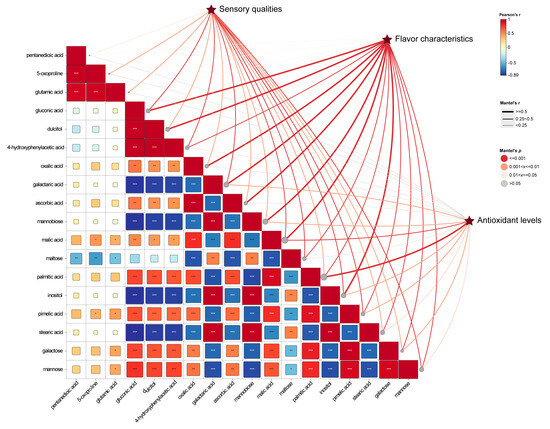 The Mantel correlation coefficient analysis (https://www.chiplot.online/ accessed on 12 June 2024) was applied to investigate the relationships between kiwifruit quality attributes (i.e., sensory, flavor, antioxidant) and differential metabolites throughout the storage period (Figure 4), revealing strong correlations among the majority of the differential compounds with kiwifruit flavor profiles and weak correlations with antioxidants. Among them, the compounds that were significantly correlated (r ≥ 0.5, p < 0.001) with flavor characteristics included gluconic acid, galacturonic acid, oxalic acid, mannobiose, and myoinositol; and palmitic acid was significantly associated with antioxidant levels. In addition, most sugars and saccharic acids were correlated with fruit sensory quality, flavor characteristics, and antioxidant levels, indicating that sugar metabolism had the most significant effect on fruit physiology during kiwifruit storage. In contrast, the correlation between amino acids and fruit quality attributes was weak.