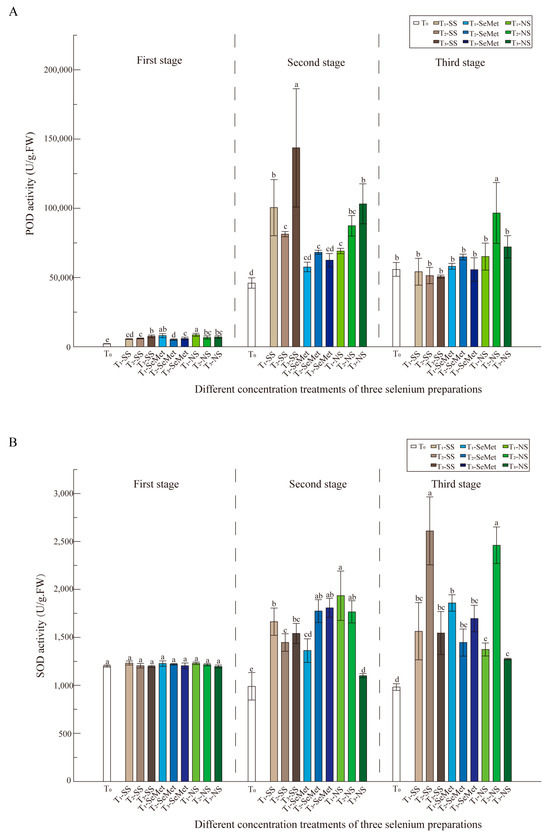 As shown in Figure 1A, the POD activity of LY in the first stage was lower than that in the other two stages; POD activity decreased significantly with increasing sodium selenite concentration but then increased again, and the high-concentration combination of sodium selenite resulted in a 2-fold increase in POD activity compared with that of the control. During the third stage, the enzyme activity of the different Se sources gradually increased, with the highest concentration combination of nanoselenium being 150% that of the control. As shown in Figure 1, POD activity was significantly affected by stages, and significantly affected by the treatment concentration. SOD activity (Figure 1B) was greater in the third stages than in the other stages, and the differences in enzyme activity among the multiple treatments in the first and second stages were relatively small, whereas the differences increased significantly in the third stage. Compared with the control, the combination of medium-concentration sodium selenite and nano-Se resulted in a significant increase in activity with a magnitude over 2 times higher (Figure 1B).