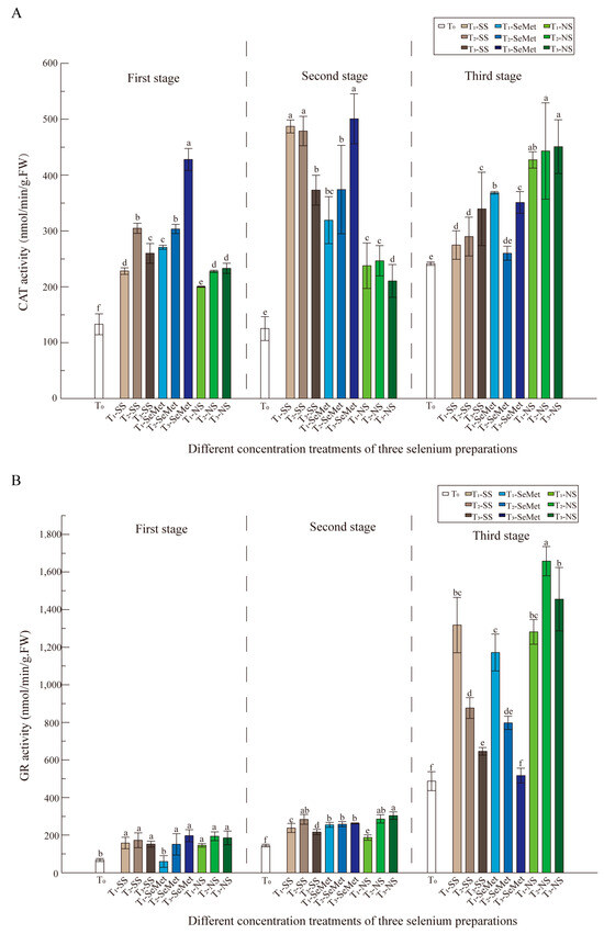 The increasing trends in CAT activity are shown in Figure 2A for the three Se forms with increasing treatment concentrations, but the decrease was more pronounced with increasing developmental stage (second stage) in the T-SS and T-NS treatments. As shown in Figure 2A, CAT activity was significantly affected by the treatment concentration and the different Se forms.