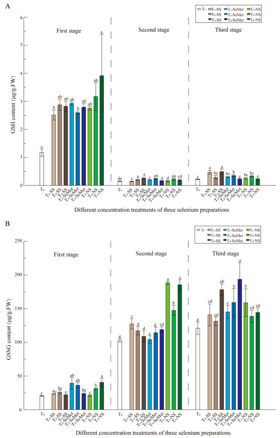The contents of the three stages tended to be low–high–high, and the contents of the second and third stages increased significantly compared with those of the first stage. The performance of different Se sources in the second stage varied: the effect of T-SS treatment decreased with increasing Se concentration, whereas the effect of T-SeMet treatment increased with increasing Se concentration. Compared with that of the control, the amplification effect of these two Se sources was smaller. During the third stage, the overall content continued to increase, and all three Se sources promoted an increase in the GSSG content (Figure 3B). Therefore, the impacts of different concentrations of Se within and between three different Se forms were significant for all physio-biochemical attributes.