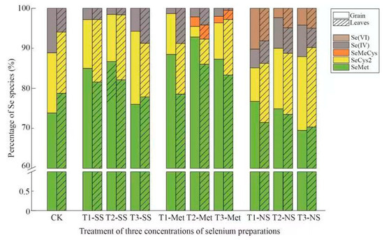 The Se speciation assay in plants was conducted as described by Yin et al. (2019) [17]. For total Se content determination, the dried leaf or grain samples were ground and digested in a mixture of HNO3-HClO4 (4:1), and the concentration of Se was measured via inductively coupled plasma atomic emission spectroscopy (ICP-AES) (SPS 1200 VR, Seiko Co., Ltd., Tokyo, Japan). Furthermore, water-extractable Se was extracted using deionized water, as described previously (Zhang et al. 2001) [42]. Afterwards, the entire operation process was carried out as described earlier [39].
