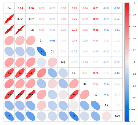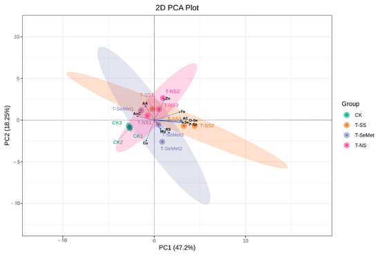 Significant differences in the measured traits were detected by ANOVA procedures in the JMP V12.0 statistical software from SAS (version 9, SAS Institute, Inc., Cary, NC, USA). The data are expressed as the mean values ± SDs. Significant differences between different Se application levels were detected via Fisher’s protected LSD test at α= 0.01 and α = 0.05. The methods of correlation analysis and principal component analysis (PCA) can be found in [49].