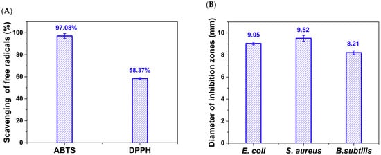 (A) Scavenging rate of ABTS and DPPH free radicals, and (B) diameter of inhibition zones for E. coli, B. subtilis, and S. aureus of CDs/PVA film.