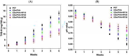 During storage, the changes in TBARS and TVB-N are usually positively correlated with the extension of storage time, and their contents will gradually increase under the action of microorganisms. As shown in Figure 11A, the TBARS values of all samples show an increasing trend as the storage time is prolonged, which may be because the lipid in the meatball samples was easy to be oxidized, and the secondary metabolites gradually accumulated with the deepening of oxidation degree. During weeks 2–6, the TBARS value of the CDs/PVA group was much lower compared to the PET group, indicating that CDs/PVA film could reduce the lipid oxidation degree during storage. This effect was related to the antioxidant properties exhibited by the CDs/PVA film. By the sixth week, the TBARS values of the three CDs/PVA+RF groups exhibited a significant decrease (p < 0.05) compared to the CDs/PVA group, which may be due to the multiplication of lipid oxidation and microbial reproduction. As previously stated, the three CDs/PVA+RF groups’ TBC levels were shown to be lower in comparison with the CDs/PVA group alone during the storage period. The CDs/PVA+RF30 group had the lowest TBARS value, followed by the CDs/PVA+RF20 group.