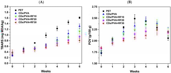 The accumulation of TVB-N is usually accompanied by an increase in pH. However, as microbial activity intensifies, the degree of spoilage increases, producing acidic substances such as lactic acid and acetic acid, ultimately leading to a decrease in pH value. In addition, meat samples are usually accompanied by lipid oxidation during storage, and the acidic products produced also may promote a decline in pH value, resulting in quality deterioration []. The intensification of lipid oxidation degree can be reflected by the increase in the TBARS value (Figure 11A). As can be seen from Figure 10B, the pH values of all samples show a downward trend as there is a prolongation of storage time. A similar downward trend was also found in mutton meatball storage test studied by Rubel et al. []. After 42 days, the PET group showed the greatest decline. The pH values of the CDs/PVA+RF20 group and CDs/PVA+RF30 group decreased slightly, demonstrating that the CDs/PVA film combined with RF treatment for 20 min or 30 min effectively inhibits the microbial reproduction and lipid oxidation in the samples.