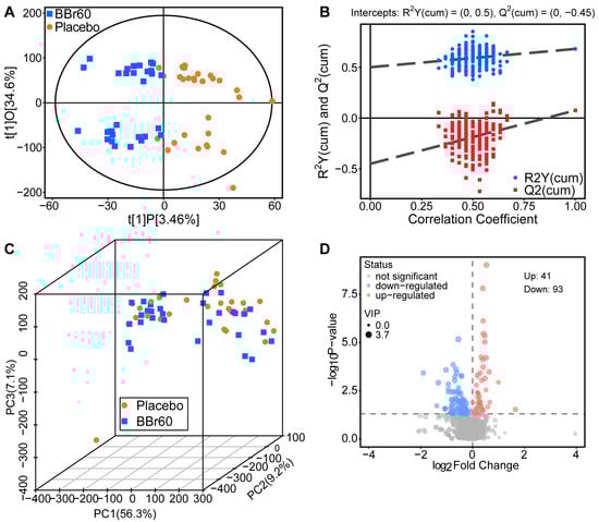 The effect of BBr60 on the serum metabolic profile in an adult population with overweight/obesity in the twelfth week. (A) A scores plot of OPLS-DA. (B) A permutation test of OPLS-DA. (C) A scores plot of PCA. (D) A volcano plot. Metabolites that are significantly up-regulated are shown in red, while those that are significantly down-regulated and non-significantly different are shown in blue or gray.