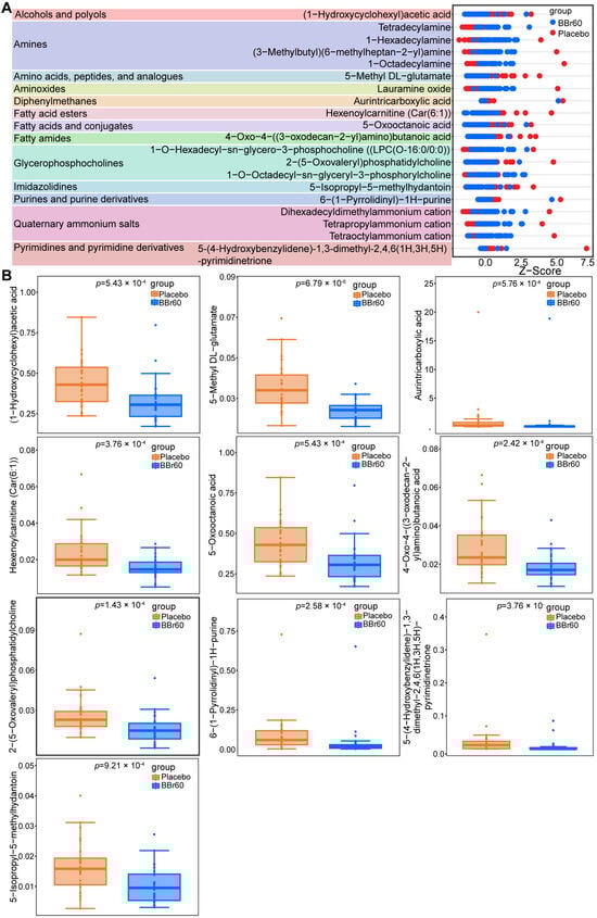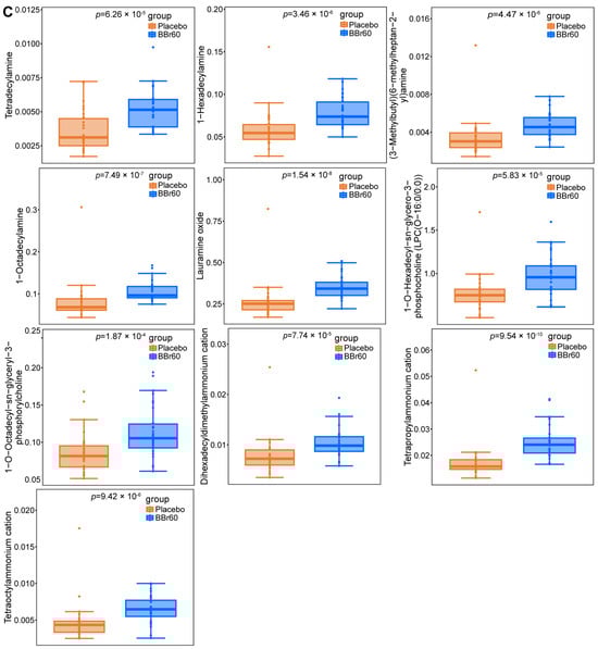 Furthermore, the top 10 differentiating substances with significant up-regulation and down-regulation were further analyzed between the BBr60 and placebo groups. They are categorized under 13 classes, including alcohols and polyols, amines, amino acids, peptides, analogues, aminoxides, diphenylmethanes, fatty acids and fatty acid esters, conjugates, fatty amides, glycerophosphocholines, imidazolidines, purines and purine derivatives, quaternary ammonium salts, pyrimidines and pyrimidine derivatives, amines, glycerophosphocholines, and quaternary ammonium salts (Figure 3A). Among the differentiating substances, all serum metabolites categorized as amines showed a statistically significant increase in response to BBr60 treatment, including Tetradecylamine, 1-Hexadecylamine, (3-Methylbutyl) (6-methylheptan-2-yl) amine, and 1-Octadecylamine (Figure 3B). The glycerophosphocholines, such as 1-O-Hexadecyl-sn-glycero-3-phosphocholine and 1-O-Octadecyl-sn-glyceryl-3-phosphorylcholine, were significantly up-regulated by BBr60 intervention, with the exception of 2-(5-Oxovaleryl) phosphatidylcholine. In contrast, other lipid metabolites including Hexenoylcarnitine (Car(6:1)), 5-Oxooctanoic acid, and 4-Oxo-4-((3-oxodecan-2-yl)amino) butanoic acid demonstrated significant down-regulation due to BBr60 treatment. Additionally, there was a significant increase in the relative abundance of quaternary ammonium salts such as dihexadecyldimethylammonium cations, tetrapropylammonium cations, and tetraoctylammonium cations in the BBr60 group. In all, BBr60 intervention presented an obvious effect on serum metabolism; 134 serum metabolites were significantly regulated by BBr60 compared to placebo intervention. A total of 20 serum metabolites were identified as vital markers and mainly categorized under amines, glycerophosphocholines, and quaternary ammonium salts.