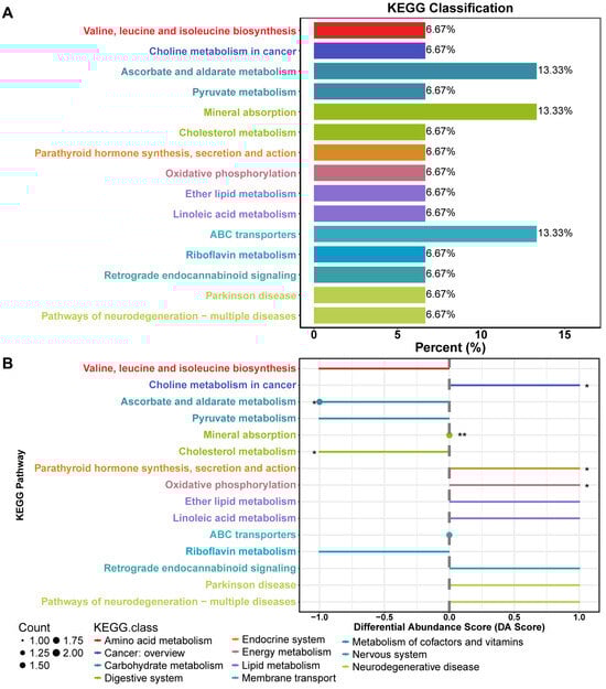 The effect of BBr60 on metabolic pathways in adult populations with overweight/obesity in the twelfth week. (A) A KEGG classification plot. (B) A differential abundance score plot, * p < 0.05, ** p < 0.01.