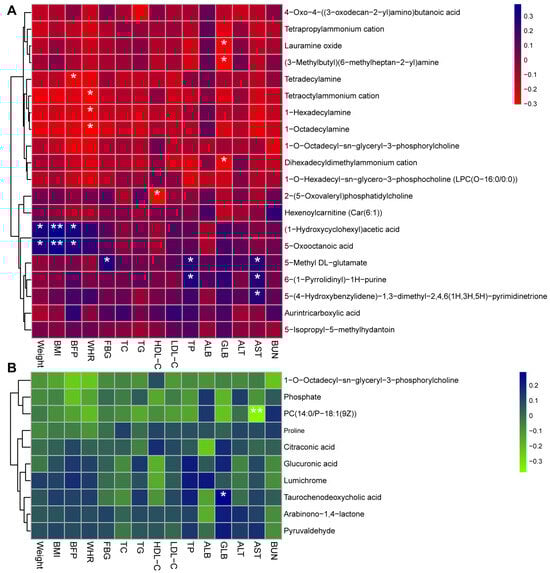 Correlation analysis between vital serum metabolites and clinic indictors in individual with overweight/obesity. (A) Correlation analysis between top 10 differentiating serum metabolites with significant up-regulation and down-regulation and clinic indexes in overweight/obesity. In R values, blue and red cells indicate positive and negative correlations, with * p < 0.05 and ** p < 0.01. (B) Analysis of correlation between serum metabolites linked to regulated metabolic pathways and clinical indices in individuals with overweight/obesity. Blue and green cells indicate positive and negative correlations, respectively; * p < 0.05 and ** p < 0.01. Abbreviations: body mass index (BMI); body fat percentage (BFP); Waist-to-Hip Ratio (WHR); fasting blood glucose (FBG); total cholesterol (TC); triglyceride (TG); high-density lipoprotein cholesterol (HDL-C); low-density lipoprotein cholesterol (LDL-C); alanine aminotransferase (ALT TG); aspartate aminotransferase (AST); total protein (TP); Albumin (ALB); globular proteins (GLB); blood urea nitrogen (BUN).