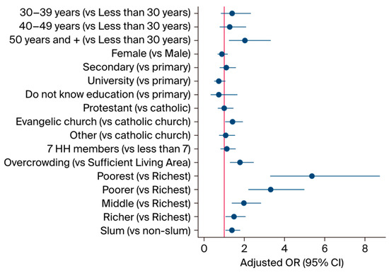 The Breslow–Day test for assessing the interaction effect was used. If it was found to be significant at p < 0.05; separate multivariate regression analyses were performed by type of neighborhood. The interactions between living space status and slum residence, between living space status and wealth index, and between wealth index and slum residence did not suggest heterogeneity between slum and non-slum residents. All of the statistical analyses were conducted using Stata Version 17.0. SVY procedures in Stata were used to account for the sampling design and selection weights. ORs and 95% CIs were estimated from the regression parameters. Variance inflation factors were calculated to test for multicollinearity, with the highest found to be 2.65. The significance level was set at p < 0.05. We used the STROBE cross-sectional reporting guidelines.