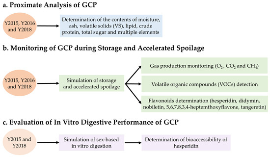 However, long-term storage and aging of CRP may be prone to mold growth or commercial falsification to ramp product costs [1,5]. It was found that storage at high temperature and high relative humidity (RH) for more than 7 days led to the growth of both mold and bacteria on CRP [6], addressing the importance of the optimal condition for storage. Moreover, developing a simple, rapid, and accurate method to classify and characterize CRP products with different aging periods is necessary. To this end, volatile organic compounds (VOCs) could be robust indicators for quality and safety assessments [7]. In fact, VOCs emitted from GCP and other varieties of CRP have been well studied [1,3,4,8,9,10,11,12,13], but there is scant information on VOCs’ emission during the shelf life. Moreover, there exists limited evidence of the precise links between the aging period and chemical compositions of CRP, the content of bioactive moieties, their bioaccessibility and their impact on consumer health. Such gaps could be bridged by using in vitro digestion models to evaluate the digestibility of food and oral formulations or to tackle inter-human variability of differences in digestion between males and females [14,15,16]. Such methods have been successfully applied to study the bioaccessibility of bioactive compounds in citrus peels [17,18,19]. Specifically, flavonoids in citrus peel extracts were sensitive to pH conditions during in vitro gastrointestinal (GI) digestion and showed poor stability and bioavailability [17]. Altogether, there is a growing body of evidence of the differential digestion of foods and oral formulations. However, we could not locate a study on storage conditions, aging time, and the differential digestive performances of CRP in healthy males and females in the scientific literature.