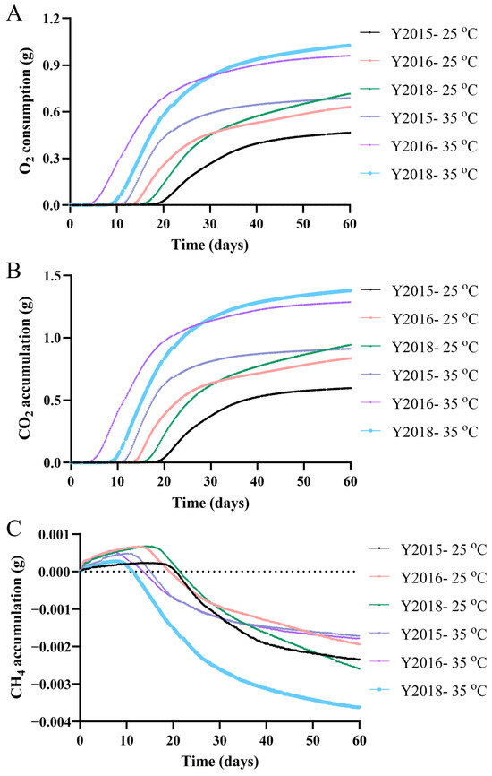 Researchers have found that the proper storage conditions for CRP to prevent mildew are a temperature below 25 °C and humidity below 85% [1]. It has been reported that after storage at high temperature and high relative humidity for more than 7 days, both mold and bacteria grew on CRP [6]. Thus, two storage scenarios were established: one at 25 °C for two months and another of accelerated spoilage at 35 °C with a similar timeframe, and humidity was closely controlled using a closed circulatory system. Samples of 4 g GCP powders passing through the 24-mesh sieve were placed into a 250 mL glass jar in which a 25 mL vial containing 20 mL of deionized water was loaded, i.e., powders did not come into direct contact with the water. Additionally, an automatic temperature and humidity recorder with an epitaxial probe (KE-COS-03, Kong Sai En) was placed in an empty jar for humidity monitoring of the entire process. Then, all jars were incubated (Jeio Tech Lab Companion incubators) at set temperatures (25 °C or 35 °C) and connected to gas collectors with a two-way valve to create the required aerobic conditions. Gas collectors for each bioreactor were connected to a MicroOxymax respirometry system (Columbus Instruments, Columbus, OH, USA) equipped with a Paramagnetic O2 Sensor (Serial 200135-3), a Non-Dispersive Infrared CO2 sensor with a 0–3% detection range (Serial 200135-4), a CH4 sensor with a 0–5% detection range (Serial 200135-5), and a gas sample drier (Serial 200135-2) [23,24]. Auto-sampling and auto-measurement of the accumulation and the composition of gases were operated by a system sampling pump (Serial 200135-1) every 4 h for each bioreactor. The measured RH in the bioreactor slightly fluctuated due to each auto-sampling of gases, which was 85.2~90.9% at 25 °C and 90.3~99.9% at 35 °C. All these experiments were carried out in triplicates.
