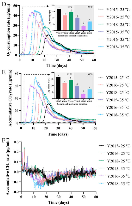 Respiration under simulated storage (25 °C and 85.2~90.9% RH) and accelerated spoilage (35 °C and 90.3~99.9% RH) for Y2015, Y2016, and Y2018 for two months. (A) O2 consumption, (B) CO2 accumulation, (C) CH4 accumulation, (D) O2 consumption rate and the insert of lag phase duration, (E) CO2 accumulative rate and the insert of lag phase duration, (F) CH4 accumulative rate. The lag phases were supposed when the initial O2 consumption rates or the CO2 accumulative rates were <1 μg/min. The p-value was obtained by a two-way analysis of variance (ANOVA) test. Different letters indicated a significant difference between samples (p < 0.05). Data represented the means of three replicate bioreactors.