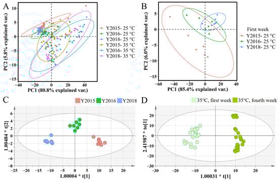 (A) PCA plot of the accumulative VOCs emitted by Citrus reticulata ‘Chachi’ (GCP) under simulated storage (25 °C and 60% RH) and accelerated spoilage (35 °C and 90% RH) for a month. (B) PCA plot of the accumulative VOCs emitted by GCP under simulated storage (25 °C and 60% RH) during the first week of a month. (C) OPLS-DA score plots for GCP under simulated storage (25 °C and 60% RH) in the first week (1~7 day) of a month with statistical parameters (R2X = 0.981, R2Y = 0.929, Q2 = 0.799). (D) OPLS-DA score plots for GCP under accelerated spoilage (35 °C and 90% RH) in the first (1~7 days) and fourth week (24~30 days) with statistical parameters (R2X = 0.908, R2Y = 0.974, Q2 = 0.961).