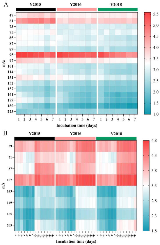 Heat-maps (log10 scales) indicating VOCs intensity from low (blue) to high (red) for different storage timepoints. (A) Heat-map for the first week (1~7 days) under simulated storage (25 °C and 60% RH). (B) Heat-map for the first week (1~7 days) and the fourth week (24~30 days) under accelerated spoilage (35 °C and 90% RH).