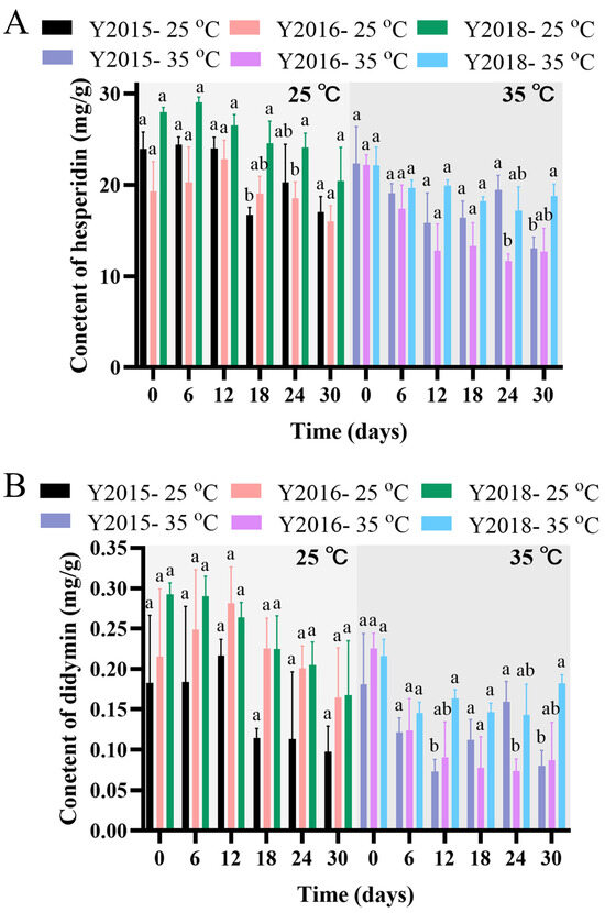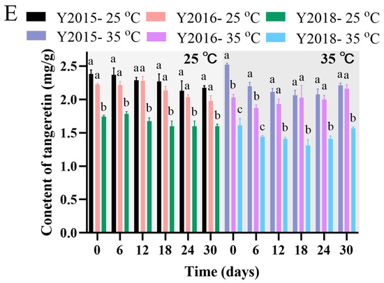 Contents of (A) hesperidin, (B) didymin, (C) nobiletin, (D) 3,5,6,7,8,3′,4′-heptamethoxyflavone (HMF), and (E) tangeretin in samples Y2015, Y2016 and Y2018 during simulated storage (25 °C and 60% RH) and accelerated spoilage (35 °C and 90% RH) for a month. Data represented the mean of three replicate bioreactors. The p-value was obtained by a two-way ANOVA test, different letters indicated a significant difference among three samples at each time section (p < 0.05).