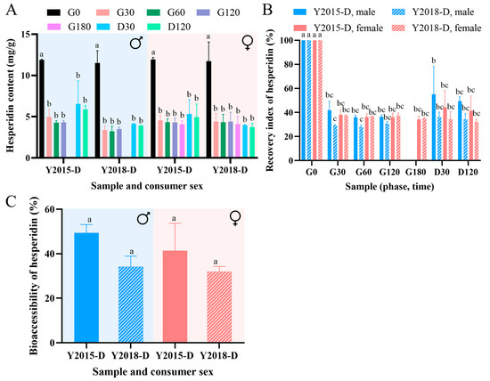 (A) Hesperidin contents in Y2015-D and Y2018-D during sex-based in vitro digestion, the p-value was obtained by a one-way ANOVA test for each sample, different letters indicated a significant difference among time sections within each group (p < 0.05). (B) Recovery index of hesperidin during in vitro digestion, the p-value was obtained by a three-way ANOVA test (assuming results at G180 for males equal to those at G120), different letters indicated a significant difference among samples (p < 0.05). (C) The in vitro bioaccessibility of hesperidin, the p-value was obtained by a two-way ANOVA test, different letters indicated a significant difference among samples (p < 0.05). Data represented the mean of two replicates.