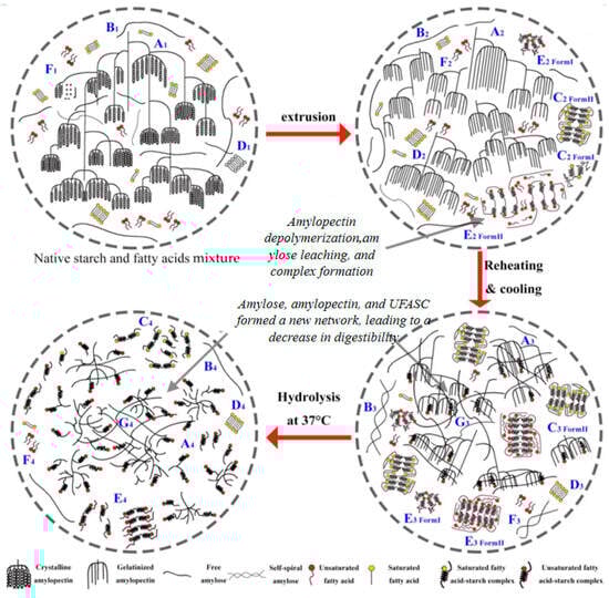 Schematic diagram of the fatty acid–starch complex formed by the extrusion, reheating, cooling, and hydrolysis process. Adapted from []. All rights reserved. Rights and permission from Elsevier.