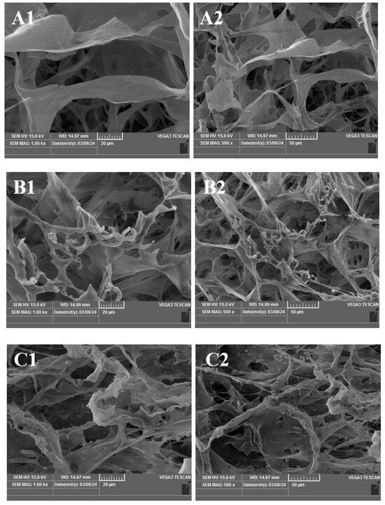 Scanning electron microscope images of chicken claw collagen under different expansion rates. Note: (A1–F1): Boneless chicken claw collagen (×1000); (A2–F2): boneless chicken claw collagen (×500); among them, (A1,A2): 0%; (B1,B2): 10%; (C1,C2): 20%; (D1,D2): 30%; (E1,E2): 40%; (F1,F2): 50%.