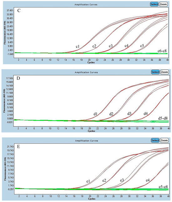 The specificity of the primers was confirmed by real-time PCR using a total of five tuna species (103 samples, described in Section 2.1). The TaqMan probe assays are highly specific since no cross-reactions were observed among the five tuna species in the three TaqMan systems (Figure 1). The TaqMan probe assays specifically amplified the DNA of ALB, BET, and SBT in the samples successfully detected. “S-shaped” positive amplification curves were observed in the target DNA templates, showing an average quantification cycle (Cq) value (±SD) of 25.37 ± 0.36 for SBT, 23.68 ± 0.25 for BET, and 14.39 ± 0.45 for ALB. DNA templates from the other tuna samples or the blank control did not amplify after 40 cycles. In previous studies, the amplification curves from real-time PCR showed cross-reactions among the ALB, BET, YFT, BFT, and SBT. Therefore, the ΔCts and fluorescence endpoint values of the experimental system had to be used as criteria for identification [34,38], making the assay complicated. The probe of the TaqMan real-time PCR assay avoids nonspecific amplification, hybridizes specifically only with the target sequence to further improve the accuracy of the results and amplify small products, and is precise and sensitive to low template DNA concentration [39,40].