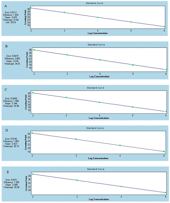 The amplification efficiency of the real-time polymerase chain reaction for SBT (A), BET (B), ALB (C), YFT (D), and BFT (E).