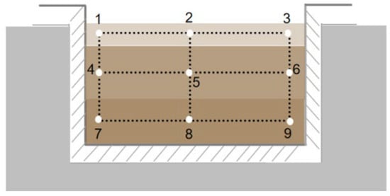 Schematic diagram of the sampling points. The numbers in the figure represent the sampling points, the diagonal filling part represents the pit mud, and the different filling colors in the pit represent the different water content at different levels.