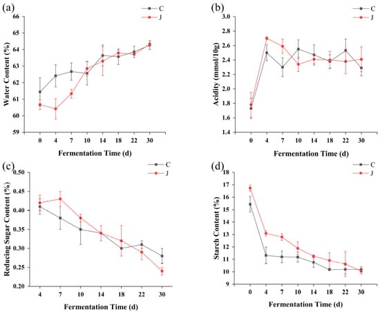 Changes in physicochemical indices during grain fermentation. (a) Moisture. (b) Acidity. (c) Reducing sugar content. (d) Starch content. C represents the traditional workshop; J represents the mechanized workshop.