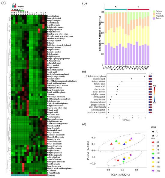 Analysis of volatile flavor compounds content in fermented grains. (a) Cluster heat map. (b) Histogram of relative content accumulation. (c) VIP score map. (d) PCoA map. C represents the traditional workshop; J represents the mechanized workshop.