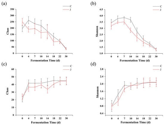 Analysis of microbial α diversity indices during grain fermentation. (a) Chao indices of bacteria. (b) Shannon indices of bacteria. (c) Chao indices of fungi. (d) Shannon indices of fungi. C represents the traditional workshop; J represents the mechanized workshop.