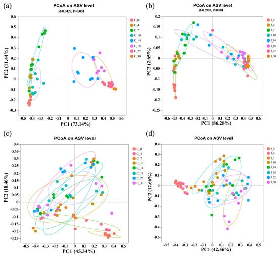 PCoA analysis of microbial communities. (a) Bacteria in fermented grains from the traditional workshop. (b) Bacteria in fermented grains from the mechanized workshop. (c) Fungi in fermented grains from the traditional workshop. (d) Fungi in fermented grains from the mechanized workshop. C represents the traditional workshop; J represents the mechanized workshop.