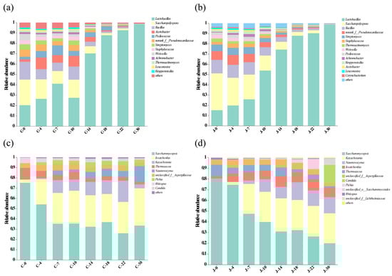Analysis of microbial community composition at the genus level in fermented grains. (a) Bacteria in the fermented grains of the traditional workshop. (b) Bacteria in the fermented grains of the mechanized workshop. (c) Fungi in the fermented grains of the traditional workshop. (d) Fungi in the fermented grains of the mechanized workshop. C represents the traditional workshop; J represents the mechanized workshop.