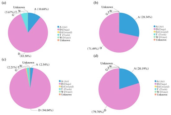 Bacteria in the fermented grains from the traditional workshop mainly came from Daqu (83.50%), followed by air (10.68%), and tools (5.67%) (Figure 7a), while fungi mainly came from Daqu (71.49%), followed by air (28.34%) (Figure 7b). In the mechanized workshop fermented grains, 94.04% of the bacterial population came from Daqu, and the air and tools contributed 2.54% and 2.21%, respectively (Figure 7c). The fungal population was mainly derived from Daqu (79.70%) and air (20.19%), while the other sources contributed less than 1% (Figure 7d). In general, the contribution of air in the traditional workshop to bacterial and fungal growth was greater than that in the mechanized workshop, but the bacterial and fungal populations of the grains from both workshops mainly originated from Daqu.