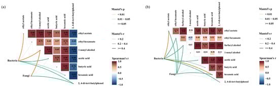 In the traditional workshop, there were five pairs of correlations between bacteria and differential flavor substances and two pairs of correlations between fungi and differential flavor substances. Bacteria showed extremely significant correlations with ethyl acetate and 1-nonyl alcohol among the differential flavor substances (p < 0.01), whereas fungi only showed significant correlations with 1-nonyl alcohol (p < 0.01) (Figure 8a). In the fermented grains from the mechanized workshop, there were six correlations between bacteria and differential flavor substances and four with fungi. There were extremely significant correlations between bacteria and ethyl acetate and hexanoic acid among the differential flavor substances (p < 0.01), whereas no significant correlations were observed between fungi and the differential flavor substances (Figure 8b). Therefore, in the fermented grains from both the traditional and mechanized workshops, the correlation between bacteria and differential flavor substances was more significant than that between fungi and differential flavor substances.