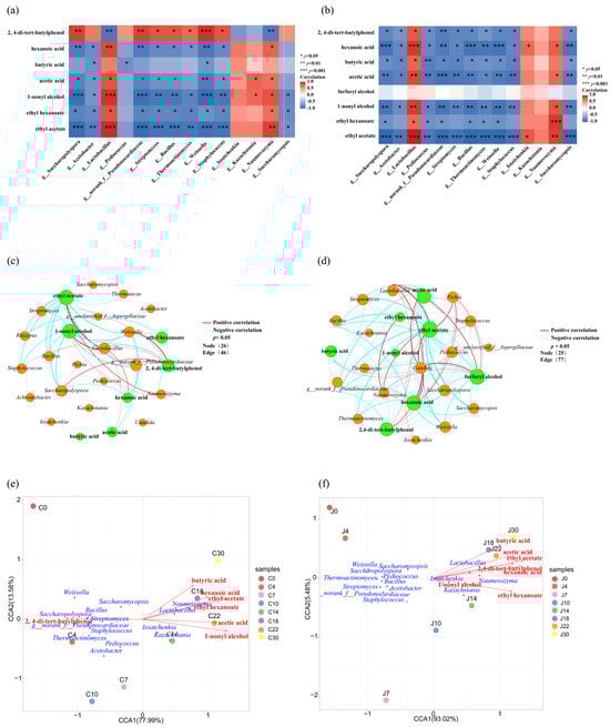 Correlation analysis of microorganisms and differential metabolites in fermented grains. (a) Heat maps of the correlation between differential microorganisms and differential flavor substances in the fermented grains from the traditional workshop. (b) Heat maps of the correlation between differential microorganisms and differential flavor substances in the fermented grains from the mechanized workshops. (c) Network maps of the correlation between the dominant microorganisms and differential flavor substances in the fermented grains from the traditional workshop. (d) Network maps of the correlation between the dominant microorganisms and differential flavor substances in fermented grains from the mechanized workshop. (e) CCA (canonical correspondence analysis) of microbes and metabolites in the fermented grains from the traditional workshop. The blue letters represent the names of the microbial genus, and the red letters represent the names of the flavor substance. (f) CCA (canonical correspondence analysis) of microbes and metabolites in the fermented grains from the mechanized workshop. C represents the traditional workshop; J represents the mechanized workshop.