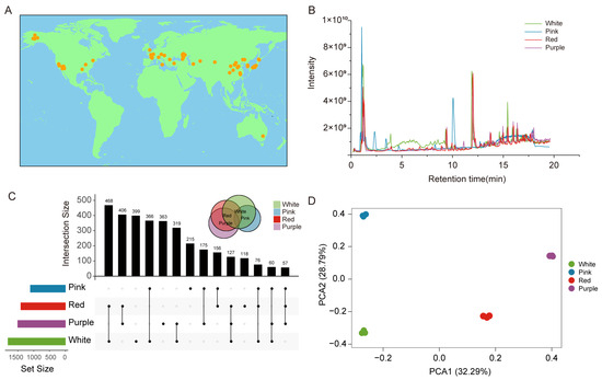 Differential analysis of the metabolome in grapes of different varieties. (A) Geographical distribution of 66 grape varieties. (B) Total ion chromatography of metabolites in four color grape populations. (C) Advanced Venn diagram (UpSet) results for the metabolome data from four color grape populations. (D) Principal component analysis (PCA) of total ion chromatography results for four color grape populations.