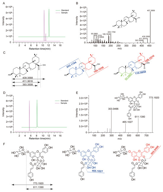 Detection and identification of specific metabolite signs by Q Exactive Focus Orbitrap LC-MS/MS. (A) The EIC (extraction) ion chromatogram of m/z 457.3669 and oleanolic acid authentic standard were detected at 10.737 min. (B) MS/MS spectra of m/z 457.3669 detected at 10.737 min, and its molecular structure. (C) Structure and fragmentation pathways of oleanolic acid. (D) The EIC (extraction) ion chromatogram of m/z 773.1920 and quercetin 3-O-beta-(6″-O-E-p-coumaroylglucoside) -7-O-beta-glucoside standard were detected at 5.446 min. (E) The mass spectrometry information of m/z 773.1920 obtained by the targeted MS2 mode, and characterized as quercetin 3-O-beta- (6″-O-E-p-coumaroylglucoside) -7-O-beta-glucoside by comparison of the standard. (F) The molecular structure of quercetin 3-O-beta- (6″-O-E-p-coumaroylglucoside) -7-O-beta-glucoside and its general fragmentation rules.