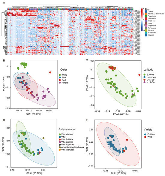 Grape metabolic profiling analysis. (A) Hierarchical clustering of 964 metabolites from 66 grape varieties. (B–E) PCA result for the metabolome data from 66 grape sample.