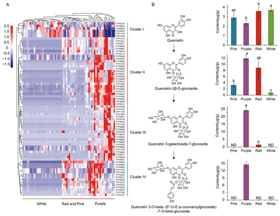 In addition, in order to further elucidate the accumulation patterns of flavonoids in different grape varieties, we conducted a quantitative analysis of the flavonoid content in four different colored grape varieties. The results showed that differently modified flavonoids exhibited distinct accumulation patterns in these grape varieties (Figure 4B). For instance, quercetin content was slightly lower in purple grapes compared to the other groups, but quercetin-3β-d-glucoside had higher levels in purple grapes than the other three colors. As the degree of modification increased, the content of modified products such as quercetin 3-galactoside-7-glucoside and quercetin 3-O-beta- (6″-O-E-p-coumaroylglucoside)-7-O-beta-glucoside in purple grapes significantly increased compared to the other three groups. Furthermore, they exhibited a higher level of flavonoid-modified products compared to the quercetin. This finding is consistent with previous research, indicating that purple grapes possess stronger antioxidant properties and higher levels of modified flavonoids [38]. These studies collectively suggest that different colored grape varieties demonstrate distinct patterns of accumulation for structurally modified flavonoids.