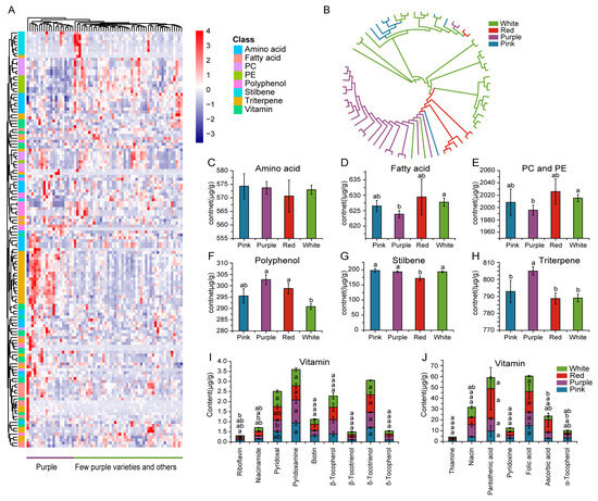 Distribution of other active compounds in different colored species. (A) Heat map visualization of the relative difference of amino acid, fatty acids, PC, PE, polyphenol, stilbene, triterpene and vitamins in different colored grape species. (B) Neighbor-joining tree of 66 Grape accessions with other active selected metabolites. The tree identifies four subgroups (purple variety, red grape, pink grape and white grape) in different colors. The scale bar indicates the simple matching distance. (C–J) Contents of metabolites in four color grape varieties. Means with different letters (a, b) are significantly different at the level of p < 0.05.