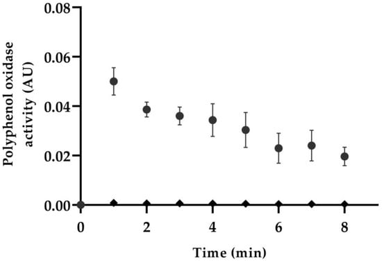 Figure 3. Enzymatic activity of polyphenol oxidase of avocado pulp and avocado pulp after SSHE processing. Circles represent the enzymatic activity found in the avocado pulp before the process, whereas rhombi are for the avocado pulp after processing.