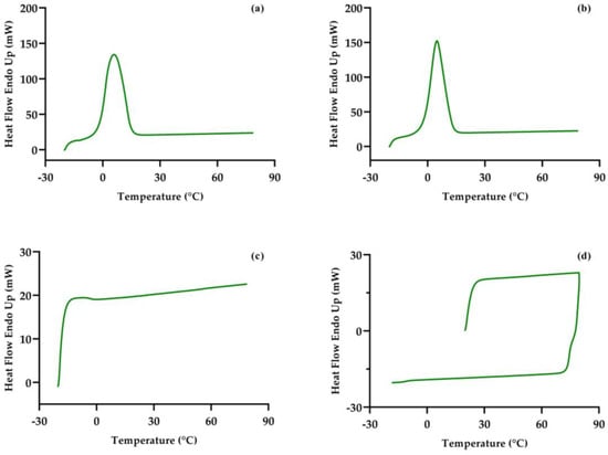 The isothermal determinations were performed in a differential scanning calorimetry (DSC) equipment (Diamond DSC, Perkin-Elmer, Waltham, MA, USA). Hermetic aluminum pans were used to process the samples. The setting conditions for the analysis were as follows: holding for 1 min at −20 °C; heating the sample from −20 °C to 80 °C at a rate of 10 °C/min. The following configuration was intended to imitate the processing conditions of the heating and cooling stages: holding for 1 min at 20 °C, heating to 80 °C, and cooling up to −20 °C at a rate of 10 °C/min.