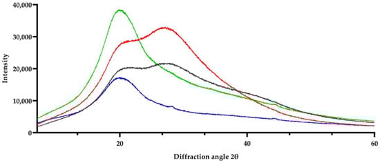 Figure 5. XRD patterns: green plot: avocado pulp without process; blue plot: avocado processed and stored at 10 °C; red plot: avocado processed and stored at 4 °C; and gray plot: avocado processed and stored at −20 °C.