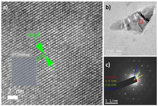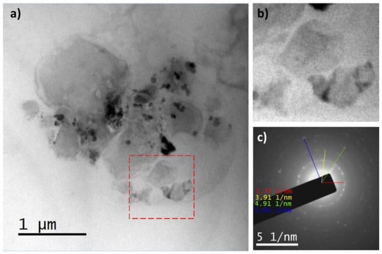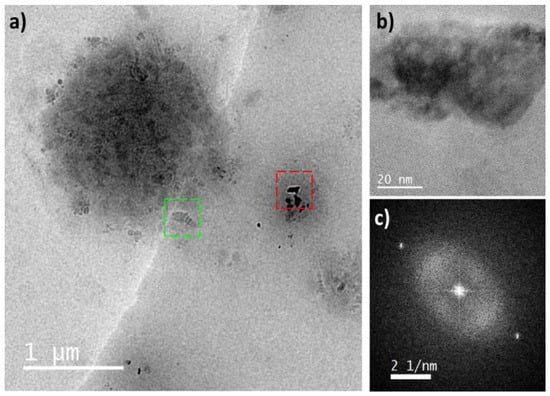 Figure 8. TEM micrographs (a,b) and FFT pattern of avocado pulp processed and stored at −20 °C in the region enclosed by the red box (c). (b) Region enclosed by the red box in the micrograph (a). The region enclosed by the green box shows particles with similar morphology to those found in samples stored at −4 °C and 10 °C.
