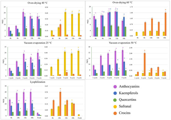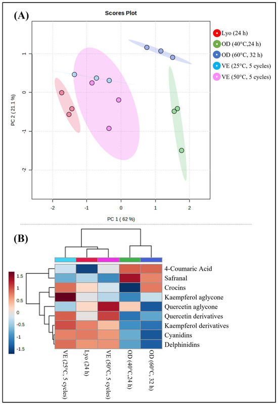 3.4. Influence of Drying Methods on the Main Bioactive Families Isolated from Saffron Petals