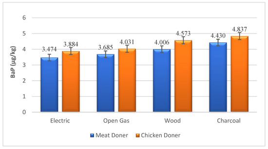 PAHs’ formation in meat doner and chicken doner samples cooked under different heating sources was investigated by GC-MS. BaP levels were used as an indicator of carcinogenic PAH contents in foods by the EU from 2005. As it has been revealed that foods containing PAHs do not always involve BaP, both PAH4 and BaP have been used as a marker of other PAH compounds in foods by the European Commission regulation on the maximum levels for certain contaminants in food, published on 25 April 2023 (2023/915). In this context, the permissible maximum levels of BaP and PAH4 in smoked meat and meat products set by the EU regulation are 2 and 12 µg/kg, respectively [30].
