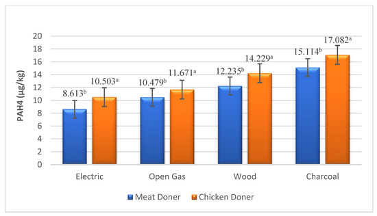 PAH4 levels in doner samples under different heating sources (µg/kg). a, b: Means with different letters are significantly different (p < 0.05).