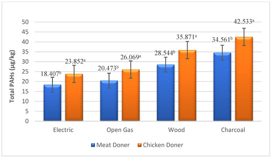 Total PAH level of doner samples under different heating sources (µg/kg). a, b: Means with different letters are significantly different (p < 0.05).