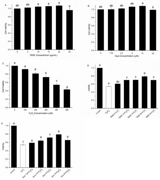Effect of cell viability treated by TBSE and quercetin and H2O2-induced cytotoxicity in HepG2 cells. (A) The survival rate of HepG2 cells exposed to a range of TBSE concentrations (0 μg·mL−1, 5 μg·mL−1, 10 μg·mL−1, 15 μg·mL−1, 20 μg·mL−1, and 25 μg·mL−1) for a duration of 24 h. (B) The survival rate of HepG2 cells exposed to a range of concentrations of quercetin (0 μM, 1.25 μM, 2.5 μM, 5 μM, 10 μM and 20 μM) for 24 h respectively. (C) The survival rates of HepG2 cells exposed to a variety of H2O2 concentrations, from 0 to 500 μM, for a period of 24 h each. (D) Survival rates of HepG2 cells that were pre-treated with various concentrations of TBSE for 24 h, followed by 4-h incubation with 400 μM H2O2. (E) HepG2 cells were first treated with various concentrations of quercetin for the duration of 24 h, followed by exposure to 400 μM H2O2 for an additional 4 h. Each value was depicted as the average ± standard deviation (n = 3). Entries in a column with different letters denote statistically significant differences (p < 0.05).
