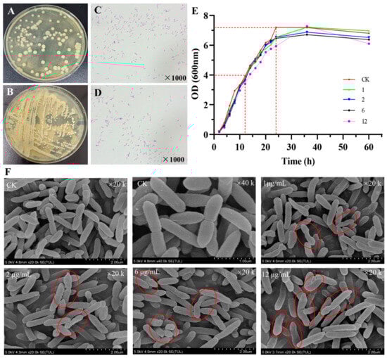 Morphology ((A,B) colony; (C,D) optical microscope) and growth curves of B. naejangsanensis ML17 under different OTA concentrations (E); (F) Scanning electron microscopy image of B. naejangsanensis ML17 morphology at different OTA concentrations. CK, 1, 2, 6, and 12 represent the growth curve of B. naejangsanensis ML17 when exposed to 0, 1, 2, 6, and 12 μg/mL OTA, respectively. Red marker shows cells with abnormal and distorted morphology.